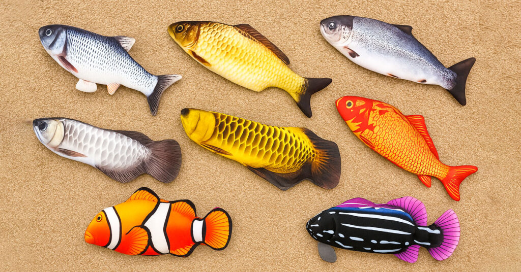 Wählen Sie zwischen Lachs, Koi, Clownfisch, Gepunktetem Fisch und weiteren—jeder mit detailgetreuen, leuchtenden Schuppen, Flossen und Farben, die fast zu echt aussehen. Die lebensechten Drucke ziehen nicht nur Ihre Aufmerksamkeit auf sich—sie fesseln sofort die Aufmerksamkeit Ihrer Katze. Ob Ihre Katze kräftige Farben oder dezenten Schimmer bevorzugt, es gibt einen Fisch, der zu ihrem neuen Lieblingsspielzeug wird.