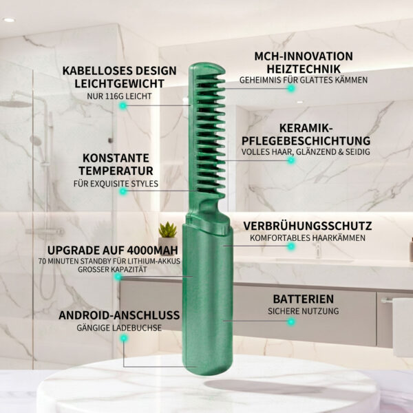 Die weit gesetzten Zinken gleiten sanft durch Knoten und Verfilzungen – ohne das unangenehme Reißen, das herkömmliche Glätteisen verursachen können. Wer dichtes, lockiges oder leicht verfilzendes Haar hat, wird den Unterschied sofort spüren: Das GlatteHaar entwirrt und glättet gleichzeitig, sodass Sie weder Strähnen verlieren noch Ihre Morgenroutine zur Geduldsprobe wird. Auch empfindliche Kopfhaut wird geschont.