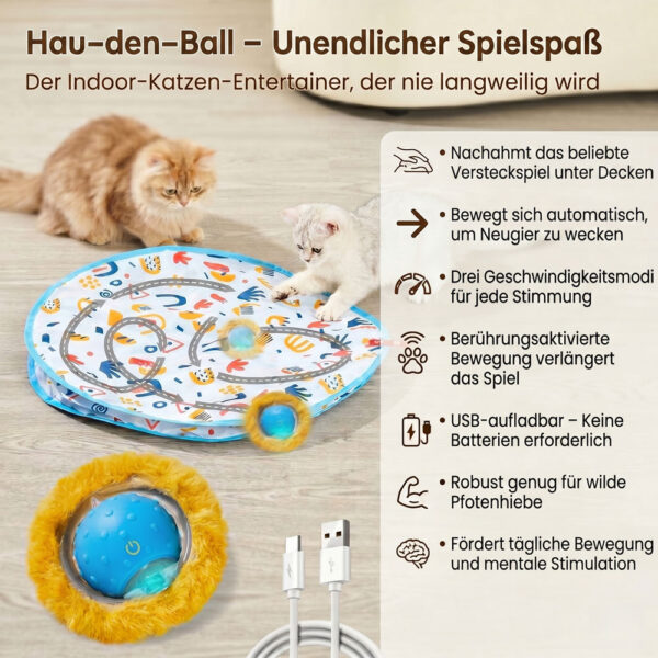 Wenn Ihre Katze sofort reagiert, sobald sich etwas unter einer Decke bewegt, ist der Hau-den-Ball genau das Richtige für sie. Der Ball steckt in einem Stoffbeutel und bewegt sich in zufälligen, unvorhersehbaren Mustern – ganz wie jenes unwiderstehliche Zucken unter der Bettdecke, das Katzen einfach nicht ignorieren können. Die eingebauten Zirpgeräusche machen daraus ein vollständiges Sinneserlebnis, dem sie sich nicht entziehen können.