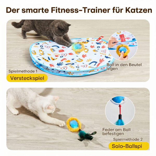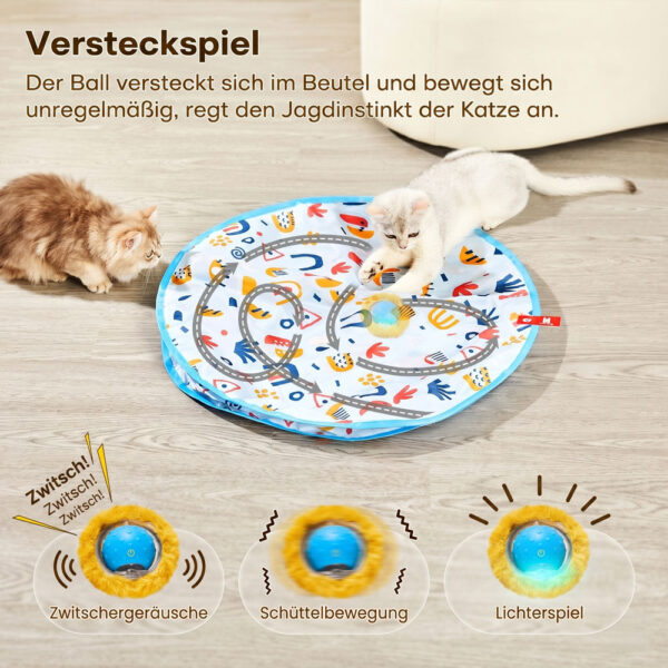 Sein motorisierter Ball versteckt sich im Stoffbeutel und bewegt sich unvorhersehbar – das aktiviert automatisch den natürlichen Jagd- und Sprunginstinkt Ihrer Katze.