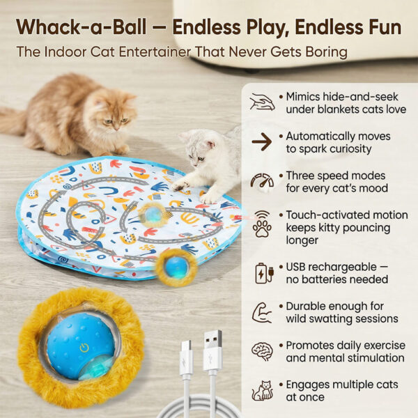 Der Hau-den-Ball erwacht im selben Moment zum Leben, in dem Ihre Katze ihn berührt – und löst unvorhersehbare Bewegungen aus, die den natürlichen Jagdinstinkt aktivieren. Wählen Sie aus drei Geschwindigkeitsstufen – schnell, langsam oder interaktiv – damit das Spielen stets zum Energielevel Ihrer Katze passt. Batterien werden nicht benötigt: einfach per USB aufladen und schon kann es losgehen.